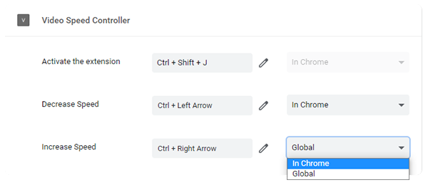 Now you will see three different shortcuts 1) To Activate the extension 2) To Decrease Speed 3) To Increase speed